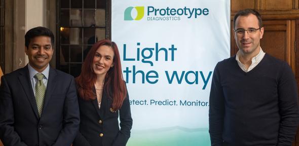 Proteotype's co-founders Wesley Sukdao, Dr Emma Yates and Professor Gonçalo Bernardes. News story curated by Dr Fiorella Dell'Olio. Photo credit: pr@proteotype.com