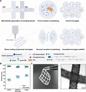 Bioprinting microporous functional living materials from protein-based core-shell microgels